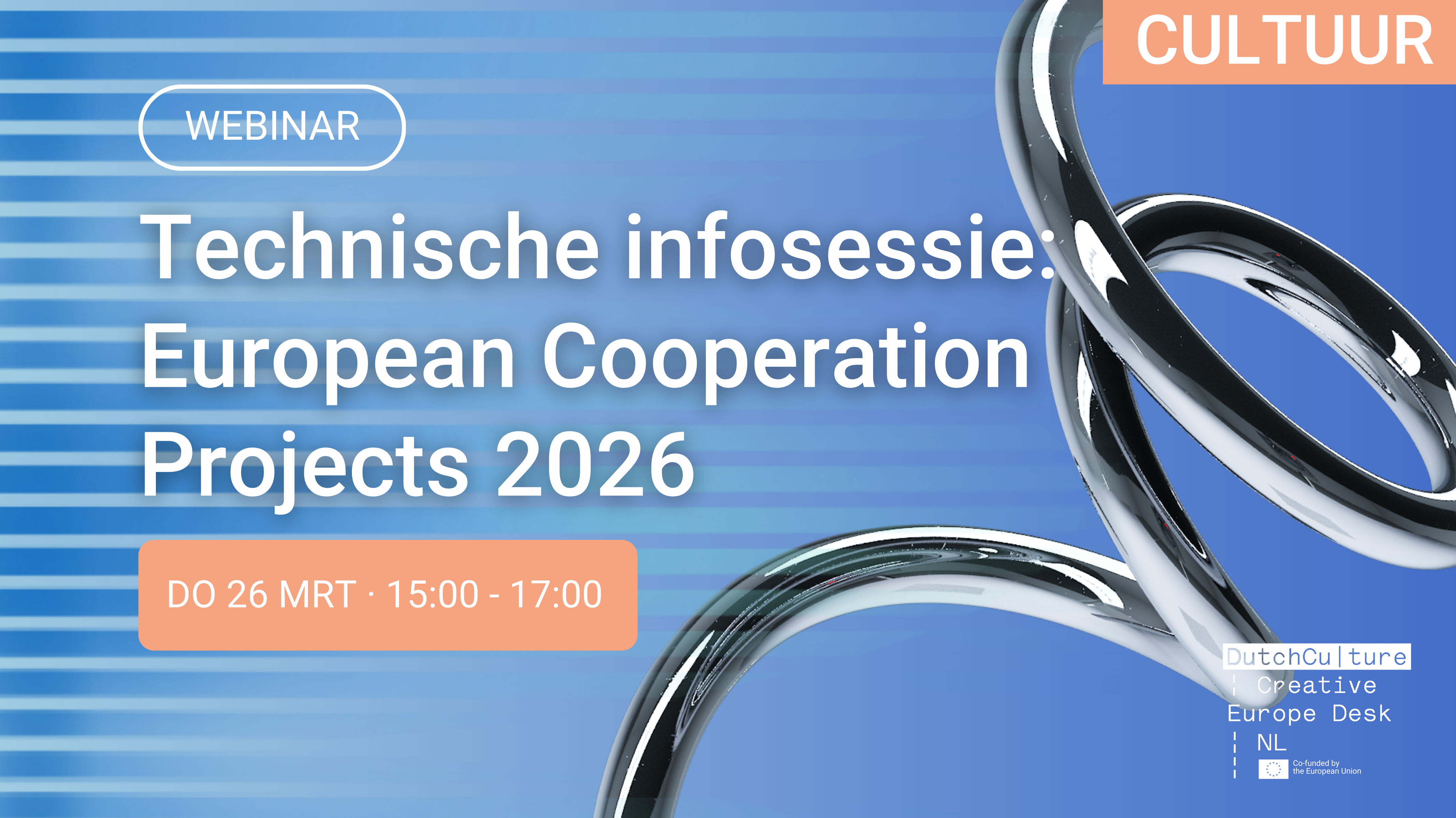 Kom dan naar de online infosessie op 26 maart van 15.00 tot 17.00 (met mogelijke uitloop). Adviseurs Ariane De Vriendt (Creative Europe Desk Vlaanderen) en Albert Meijer (DutchCulture | Creative Europe Desk NL) geven een overzicht van de belangrijkste onderdelen van de aanvraag. Aansluitend is er ruimte om vragen te stellen.